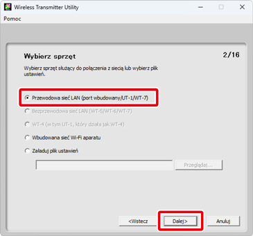 Wybierz Przewodowa sieć LAN (port wbudowany/UT-1/WT-7) i kliknij Dalej.