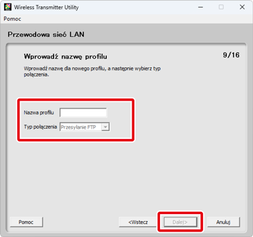 Wprowadź nazwę profilu o długości do 16 znaków i wybierz typ połączenia spośród Przesyłanie FTP, Przesyłanie zdjęć, Sterowanie aparatem i Serwer HTTP. Kliknij Dalej po zakończeniu regulacji ustawień.