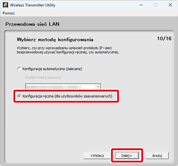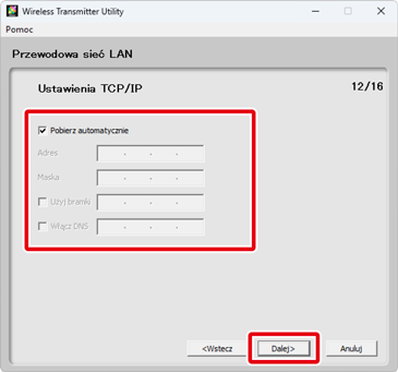 Jeśli wybrano Konfiguracja automatyczna (zalecane) w kroku 7, ustawienia TCP/IP zostaną dostosowane automatycznie. Przejdź do kroku 9. Zwróć uwagę, że Konfiguracja automatyczna (zalecane) nie jest dostępna, jeśli: