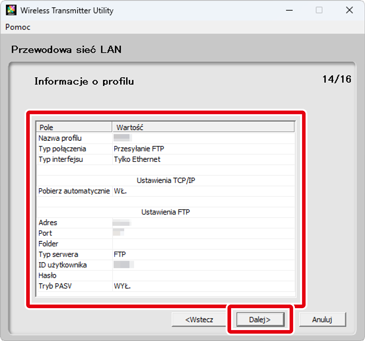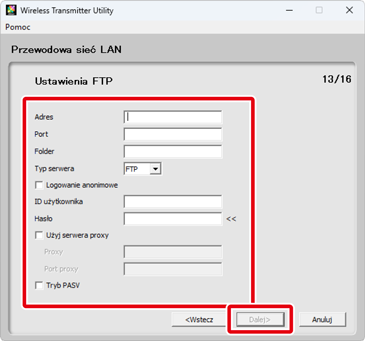 Ustawienia serwera FTP będą dostępne tylko wtedy, gdy Przesyłanie FTP zostanie wybrane w kroku 6. Przejdź do kroku 10, jeśli wybrano inną opcję. Po dostosowaniu ustawień kliknij przycisk Dalej. Aby uzyskać więcej informacji, skorzystaj z poniższej tabeli.