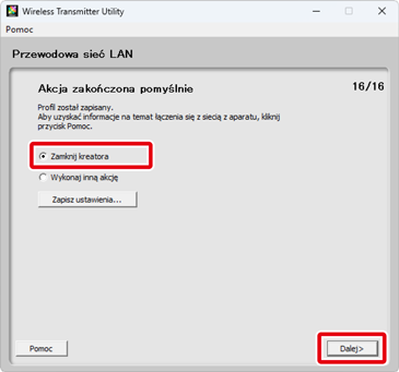 Na tym kończy się konfiguracja sieci Ethernet (przewodowej sieci LAN). Aby uzyskać informacje na temat łączenia się z siecią z aparatu, patrz „Nawiązywanie połączenia z użyciem profili utworzonych na komputerze”.