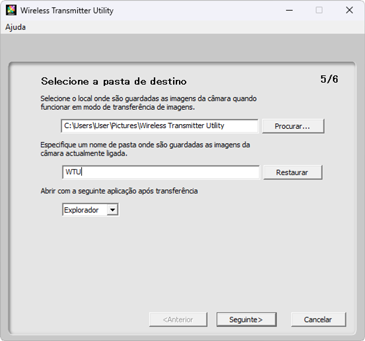 Para escolher uma subpasta para fotografias transferidas da câmara, feche a janela, conecte a câmara e o computador através de USB e, em seguida, reinicie o Wireless Transmitter Utility. Quando lhe for solicitado que escolha o hardware, selecione LAN com fios (porta incorporada/UT-1/WT-7), clique em Seguinte e selecione Selecione pasta destino e aplicação na caixa de diálogo de ação. Clicar em Seguinte levará a uma caixa de diálogo na qual poderá selecionar uma subpasta sob a pasta de destino.