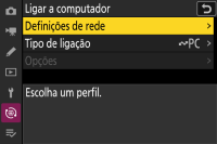 Selecione LAN com fios/WT > Definições de rede no menu de configuração da câmara e siga as instruções no ecrã para criar um perfil de rede. Para obter informações sobre a criação de perfis de Ethernet, consulte o Manual de referência da câmara. Para obter informações sobre a utilização do WT-6, consulte o Manual de referência da câmara ou o manual do WT-6.
