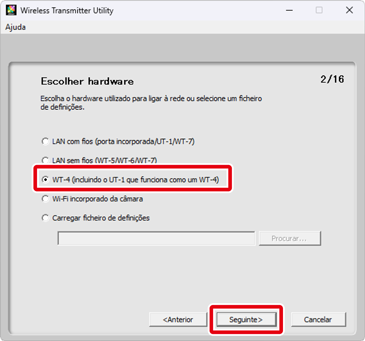 Selecionar WT-4 (incluindo o UT-1 que funciona como um WT-4) e clicar em Seguinte.