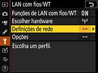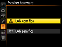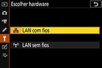 Selecionar LAN com fios/WT > Escolher hardware > LAN com fios no menu de configuração da câmara.
