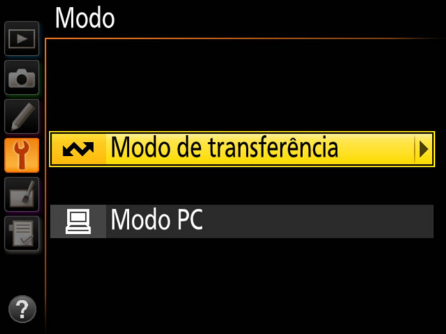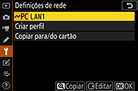 Escolha entre Modo de transferência e Modo PC. Premir o multisseletor à direita exibe uma lista de perfis de rede.