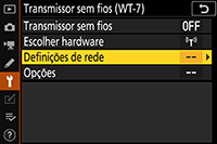 Selecionar Transmissor sem fios (WT-7) > Definições de rede no menu de configuração da câmara.