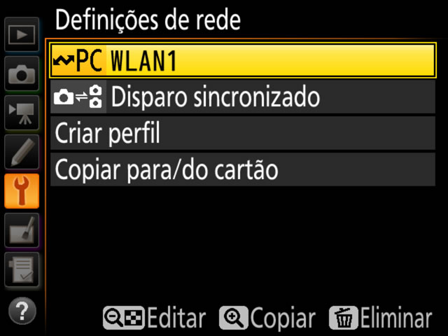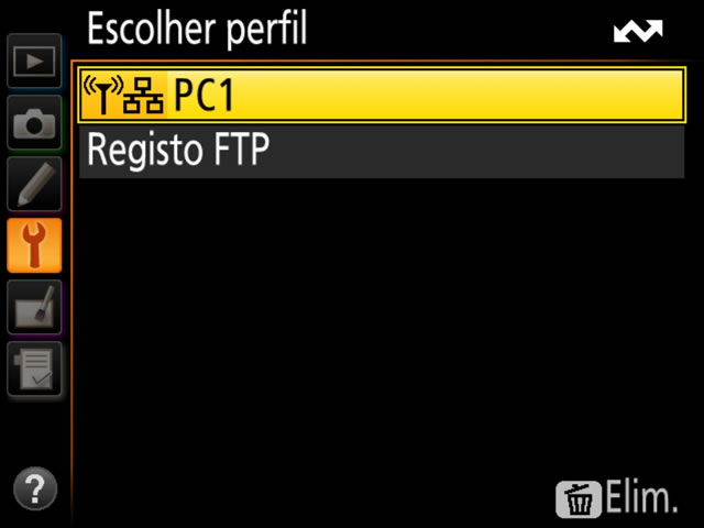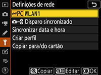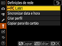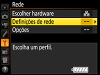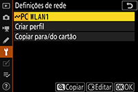 Marque um perfil e prima o multisseletor à direita para selecionar e voltar para o menu Rede. Se selecionou Modo de transferência no Passo 3, ajuste as Definições de transferência como descrito no manual do WT-4.