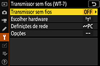 Selecionar Transmissor sem fios (WT-7) > Escolher hardware > LAN sem fios no menu de configuração da câmara.