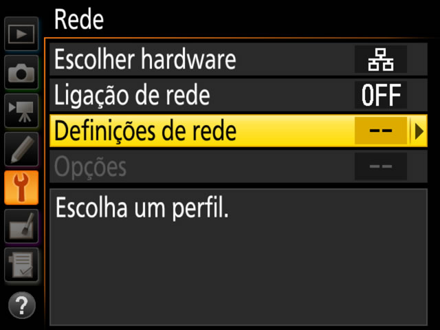 Marque Definições de rede e prima o multisseletor à direita para visualizar uma lista de perfis de rede.