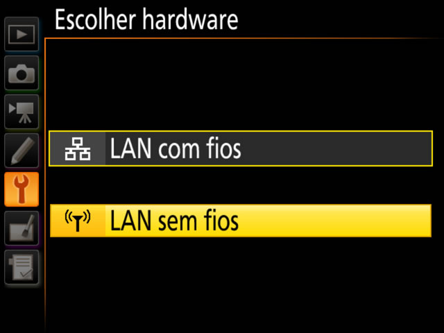 Selecionar LAN com fios/WT > Escolher hardware > LAN sem fios no menu de configuração da câmara.