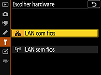 Selecionar Transmissor sem fios (WT-7) > Escolher hardware > LAN com fios no menu de configuração da câmara.