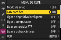 - Z8: selecione USB-LAN para Ligação de dados USB no menu de redes da câmara.