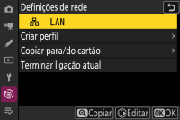 Marque um perfil e prima o multisseletor à direita para voltar ao menu LAN com fios/WT. Aguarde que a câmara estabeleça a ligação.