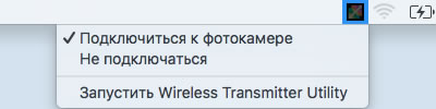 - После установки Wireless Transmitter Utility ярлык Wireless Transmitter Utility в строке меню можно использовать для прекращения подключения к фотокамере или запуска Wireless Transmitter Utility. Следующие параметры доступны только в режиме работы Передача изображений: