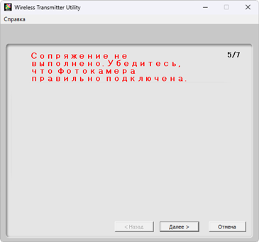 Приложение Wireless Transmitter Utility автоматически выполняет сопряжение фотокамеры и компьютера. После выполнения сопряжения фотокамеры и отображения в Wireless Transmitter Utility соответствующих сообщений нажмите кнопку OK на фотокамере и щелкните Далее в Wireless Transmitter Utility.