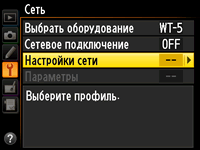 Выберите Сеть > Настройки сети в меню настройки фотокамеры и следуйте инструкциям на экране, чтобы создать сетевой профиль. Для получения информации о создании профилей Ethernet см. Руководство по сети, поставляемое с фотокамерой. Для получения информации об использовании WT-7 или WT-5 см. документацию, прилагаемую к устройству.