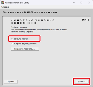 Теперь настройка беспроводного подключения завершена. Для получения подробной информации о подключении к сети с фотокамеры см. «Подключение с использованием профилей, созданных на компьютере».
