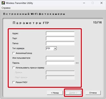 Настройте параметры FTP-сервера и щелкните Далее. Для получения дополнительной информации обратитесь к приведенной ниже таблице.