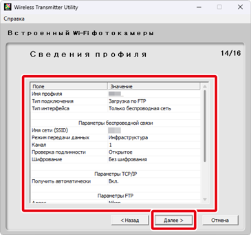 Чтобы редактировать существующий сетевой профиль, выберите его и щелкните Далее. Чтобы удалить существующий профиль, выберите его и щелкните Удалить профиль. Wireless Transmitter Utility нельзя использовать для изменения профилей, которые были защищены с помощью параметра Защита паролем фотокамеры. Выберите Выкл. для Защита паролем, прежде чем удалять или изменять профили.