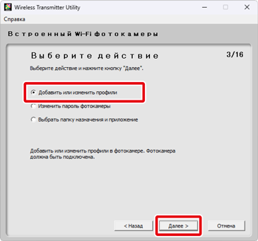 Wireless Transmitter Utility можно использовать только для создания сетевых профилей для функции Загрузка по FTP. Используйте фотокамеру для создания профилей для функций Передача изображений и Управление фотокамерой.