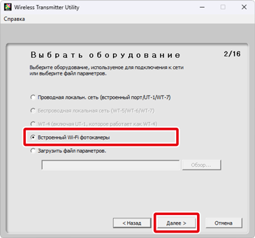 Выберите Встроенный Wi-Fi фотокамеры и нажмите Далее.