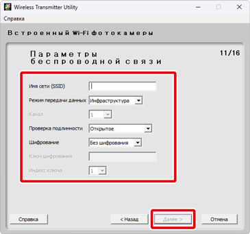 Если Вы выбрали Сеть инфраструктуры (рекомендуется), выберите параметры сети, которые будут использоваться для подключения из опускающегося меню и введите Ключ шифрования. Mac пользователи могут выбрать Шифрование и Индекс ключа из опускающихся меню.