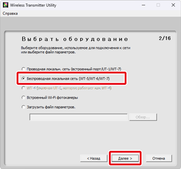 Выберите Беспроводная локальная сеть (WT-5/WT-6/WT-7) и нажмите Далее.