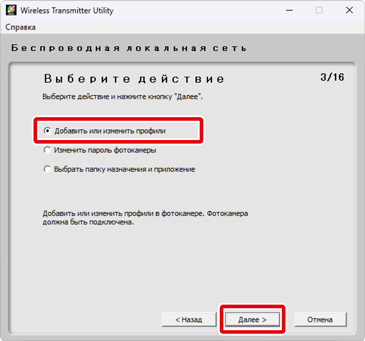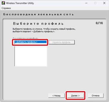 Чтобы редактировать существующий сетевой профиль, выберите его и щелкните Далее. Чтобы удалить существующий профиль, выберите его и щелкните Удалить профиль. Wireless Transmitter Utility нельзя использовать для изменения профилей, которые были защищены с помощью параметра Защита паролем фотокамеры. Выберите Выкл. для Защита паролем, прежде чем удалять или изменять профили.