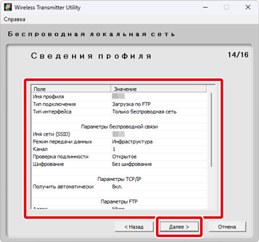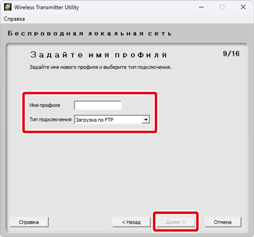 Введите имя профиля длиной до 16 символов и выберите тип подключения Загрузка по FTP, Передача изображений, Управление фотокамерой или Сервер HTTP. После завершения настроек щелкните Далее.