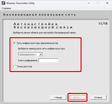 При выборе Автоматическая настройка (рекомендуется) в шаге 7, настройки беспроводной локальной сети будут установлены автоматически. Выберите Сеть инфраструктуры (рекомендуется) или Точка доступа и щелкните Далее для перехода к Шагу 10.