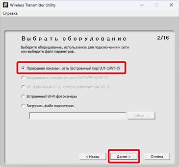 Выберите Проводная локальн. сеть (встроенный порт/UT-1/WT-7) и нажмите Далее.