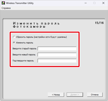 При выборе Изменить пароль фотокамеры до нажатия кнопки Далее в шаге 4 отображается диалоговое окно для ввода пароля. При введении пароля в это диалоговое окно Wireless Transmitter Utility отобразит приглашение для ввода пароля, когда фотокамера будет подключаться к другим компьютерам. После ввода правильного пароля это сообщение больше не будет появляться.