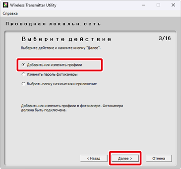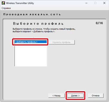 Чтобы редактировать существующий сетевой профиль, выберите его и щелкните Далее. Чтобы удалить существующий профиль, выберите его и щелкните Удалить профиль. Wireless Transmitter Utility нельзя использовать для изменения профилей, которые были защищены с помощью параметра Защита паролем фотокамеры. Выберите Выкл. для Защита паролем, прежде чем удалять или изменять профили.