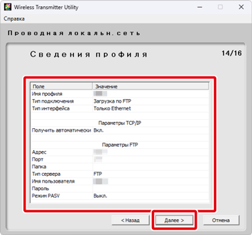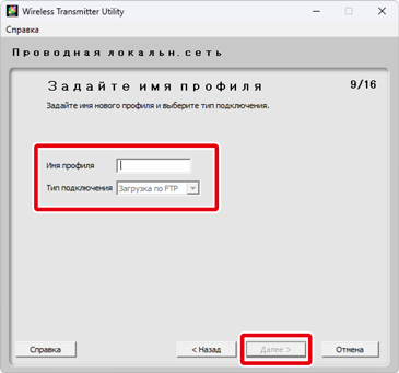 Введите имя профиля длиной до 16 символов и выберите тип подключения Загрузка по FTP, Передача изображений, Управление фотокамерой или Сервер HTTP. После завершения настроек щелкните Далее.