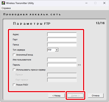 Настройки FTP-сервера будут доступны, только если Загрузка по FTP выбрано в Шаге 6. Если выбран другой параметр, перейдите к Шагу 10. После настройки параметров щелкните Далее. Для получения дополнительной информации обратитесь к приведенной ниже таблице.