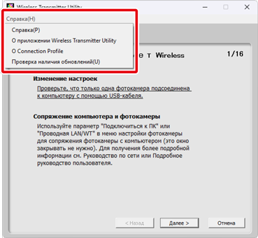 Просмотрите информацию о версии Wireless Transmitter Utility и Connection Profile.