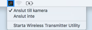 - När Wireless Transmitter Utility är installerat kan ikonen Wireless Transmitter Utility i menyraden användas för att avsluta anslutningen till kameran eller starta Wireless Transmitter Utility. Det följande är endast tillgängligt när Bildöverföring är valt som driftläge: