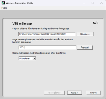 För att välja en undermapp för bilder som har laddats ned från kameran, stäng fönstret, anslut kameran och datorn via USB och starta sedan om Wireless Transmitter Utility. När du uppmanas att välja maskinvara, välj Kabelanslutet nätverk (inbyggd port/UT-1/WT-7), klicka på Nästa och välj Välj målmapp och program i dialogrutan för åtgärd. Klicka på Nästa för att gå vidare till en dialogruta där du kan välja en undermapp under målmappen.