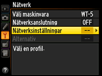 Välj Nätverk > Nätverksinställningar i kamerans inställningsmeny och följ instruktionerna på skärmen för att skapa en nätverksprofil. För information om att skapa Ethernet-profiler, se Nätverksguiden som medföljer kameran. För information om att använda WT-7 eller WT-5, se dokumentationen som medföljer enheten.
