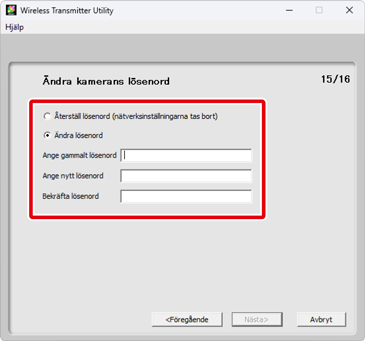 Om du väljer Ändra kamerans lösenord innan du klickar på Nästa i steg 4 visas en dialogruta för inmatning av lösenord. Om ett lösenord anges i denna dialogruta visar Wireless Transmitter Utility en lösenordsruta när kameran ansluts till andra datorer. När rätt lösenord har angetts visas inte uppmaningen igen.
