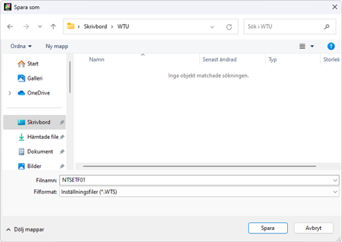 Klicka på Spara inställningar i steg 12 för att spara nätverksprofiler i “wts”- eller “txt”-format. För att ladda sparade profiler, klicka på Läs in inställningsfil i Steg 3, klicka på Bläddra och välj önskad fil.