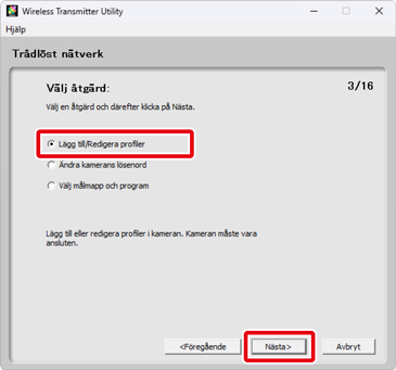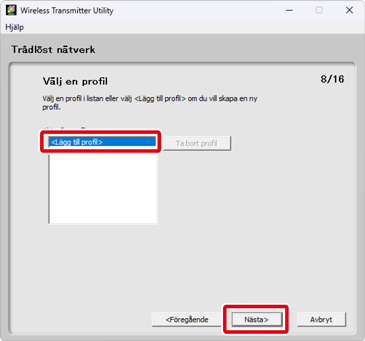 För att redigera en befintlig nätverksprofil, välj den och klicka på Nästa. För att ta bort en befintlig profil, välj den och klicka på Ta bort profil. Wireless Transmitter Utility kan inte användas för att ändra profiler som har skyddats genom kamerans alternativ Lösenordsskydd. Välj Av för Lösenordsskydd innan du raderar eller ändrar profiler.