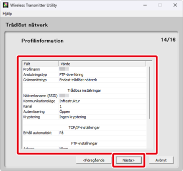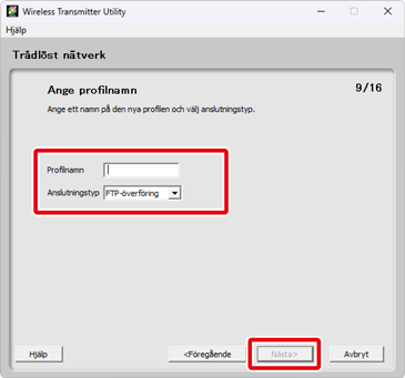 Ange ett profilnamn på upp till 16 tecken och välj en anslutningstyp från FTP-överföring, Bildöverföring, Camera control eller HTTP-server. Klicka på Nästa när inställningarna har slutförts.
