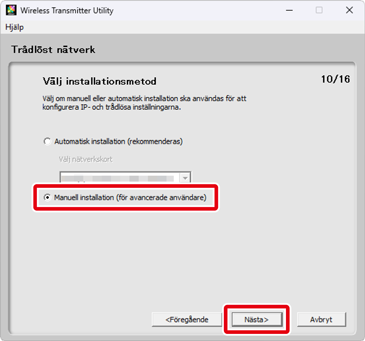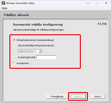 Om du valde Automatisk installation (rekommenderas) i steg 7 kommer inställningarna för trådlöst nätverk att justeras automatiskt. Välj Infrastrukturnätverk (rekommenderas) eller Accesspunkt och klicka på Nästa för att gå vidare till Steg 10.