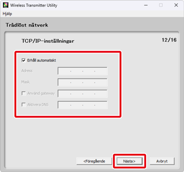 Observera att IP-adressen måste skilja sig från den för datorn, accesspunkten för det trådlösa nätverket och FTP-servern. Till exempel, om IP-adressen för det trådlösa nätverkets accesspunkt är “192.168.1.2” kan den för datorn eller FTP-servern vara “192.168.1.3”, och den för den trådlösa sändaren (WT-5, WT-6 eller WT-7) kan vara “192.168.1.4”. Observera dock att IP-adresserna för det trådlösa nätverkets accesspunkt, den trådlösa sändaren (WT-5, WT-6 eller WT-7), datorn och FTP-servern måste alla tillhöra samma klass.
