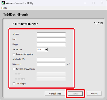 FTP-serverinställningar är endast tillgängliga om FTP-överföring har valts i Steg 6. Fortsätt till Steg 11 om ett annat alternativ har valts. Klicka på Nästa när du har justerat inställningarna. För mer information, se tabellen nedan.