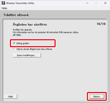 Inställningen för trådlösa nätverk är nu slutförd. För information om att ansluta till nätverket från kameran, se “Ansluta med hjälp av profiler skapade på en dator”.
