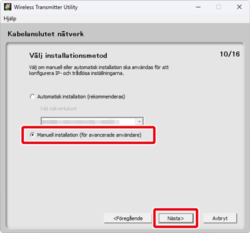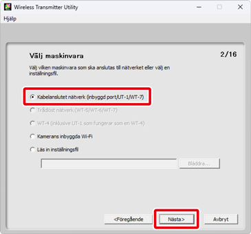 Välj Kabelanslutet nätverk (inbyggd port/UT-1/WT-7) och klicka på Nästa.