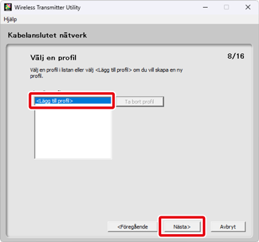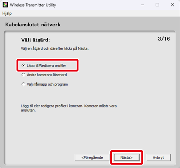 För att redigera en befintlig nätverksprofil, välj den och klicka på Nästa. För att ta bort en befintlig profil, välj den och klicka på Ta bort profil. Wireless Transmitter Utility kan inte användas för att ändra profiler som har skyddats genom kamerans alternativ Lösenordsskydd. Välj Av för Lösenordsskydd innan du raderar eller ändrar profiler.